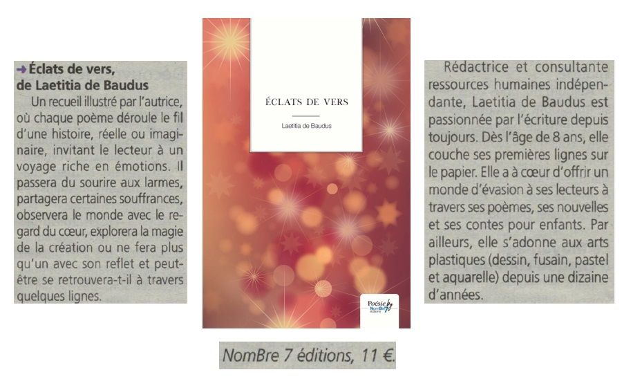 Article annonçant la sortie de mon recueil de poèmes "Éclats de vers" aux Éditions Saint-Honoré courant octobre 2022